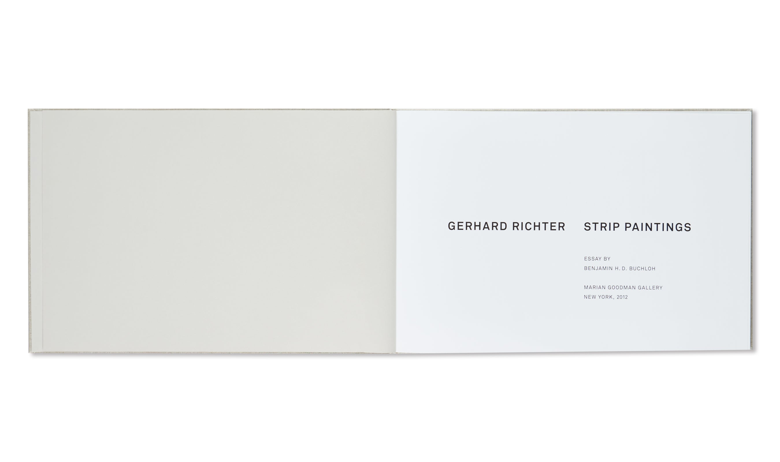 ドイツ人画家、ゲルハルト・リヒター(Gerhard Richter)の作品集。本作は、作者の連作「Strip Painting」シリーズからセレクトした作品を収録、大きな判型で贅沢な仕様となっている。2012年にNYのギャラリー「Marian Goodman Gallery」で開催された展覧会に伴い刊行された。ドイツ人美術史家のベンジャミン・H・D・ブクロー(Benjamin H.D. Buchloch)による2つのエッセイ『Gerhard Richter: Glass Insurrection』『The Chance Ornament: Painting Progress Painting Loss』を収録。前者では「Standing Glass Panels」(2002-2011)シリーズについて、後者では「Strip Painting」について言及し、どちらの文章もガラス、金属パネル、デジタル印刷など様々な素材に対する作者の興味に新たな光明を見出し、またその素材は「Strip Painting」がイメージの制作という観点において偶然性を持つ役割というものを広く探求しており、それ自体が創造性のある過程と共にある。本作品群に関し、作者はデジタル時代において関連性のある一媒体として絵画やその位置付けに対し疑問を投げかける。マルセル・デュシャン(Marcel Duchamp)の作品「大ガラス(Large Glass)」(1915-1923)のような他作家が大胆に素材を使用した作品や、作者自身が手がけた過去の作品のうちカラーチャートのように作られたものを反映した今回の一連の作品群は、視覚芸術という分野ですでに大きく貢献できている一人の作家であることを示している。