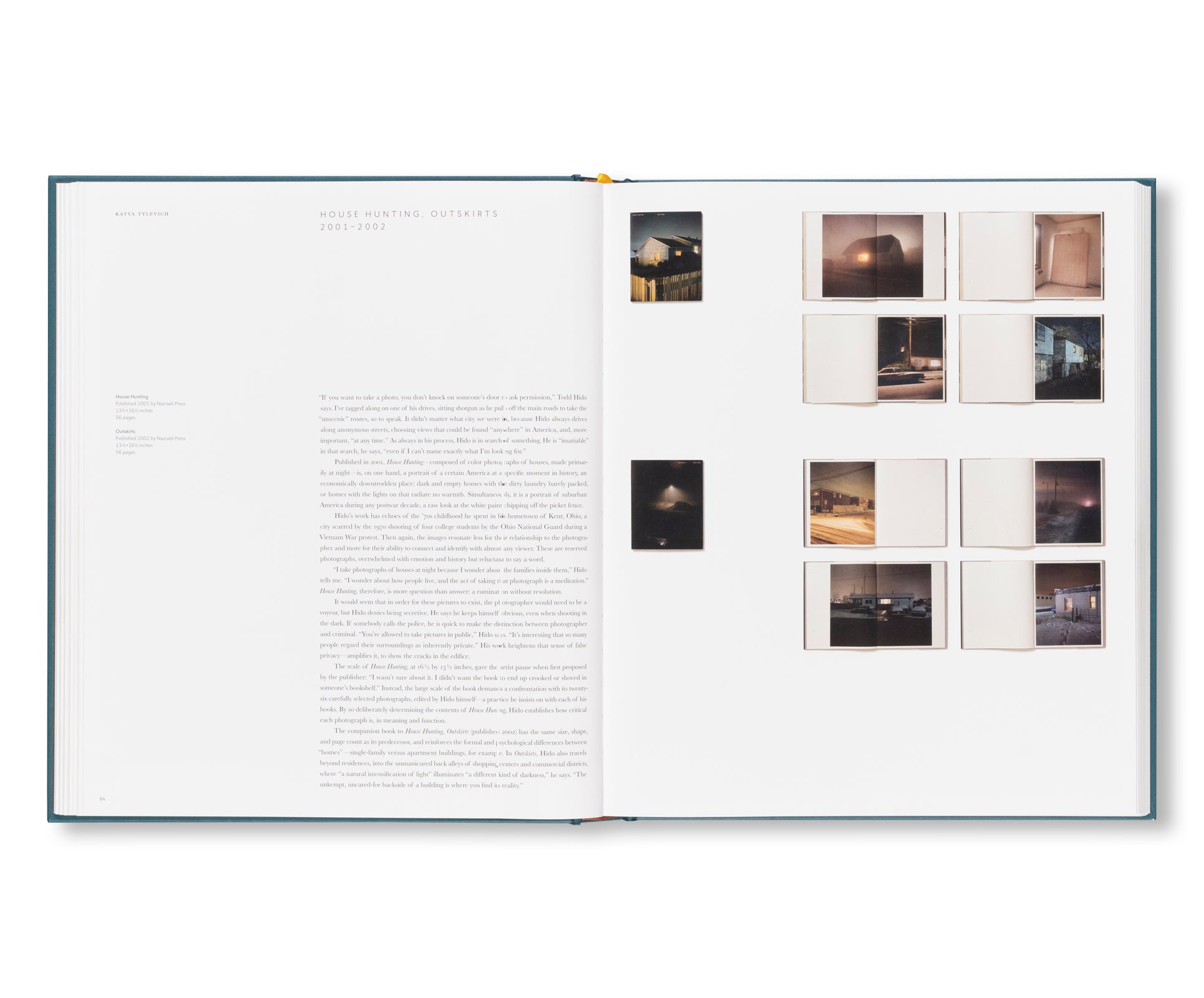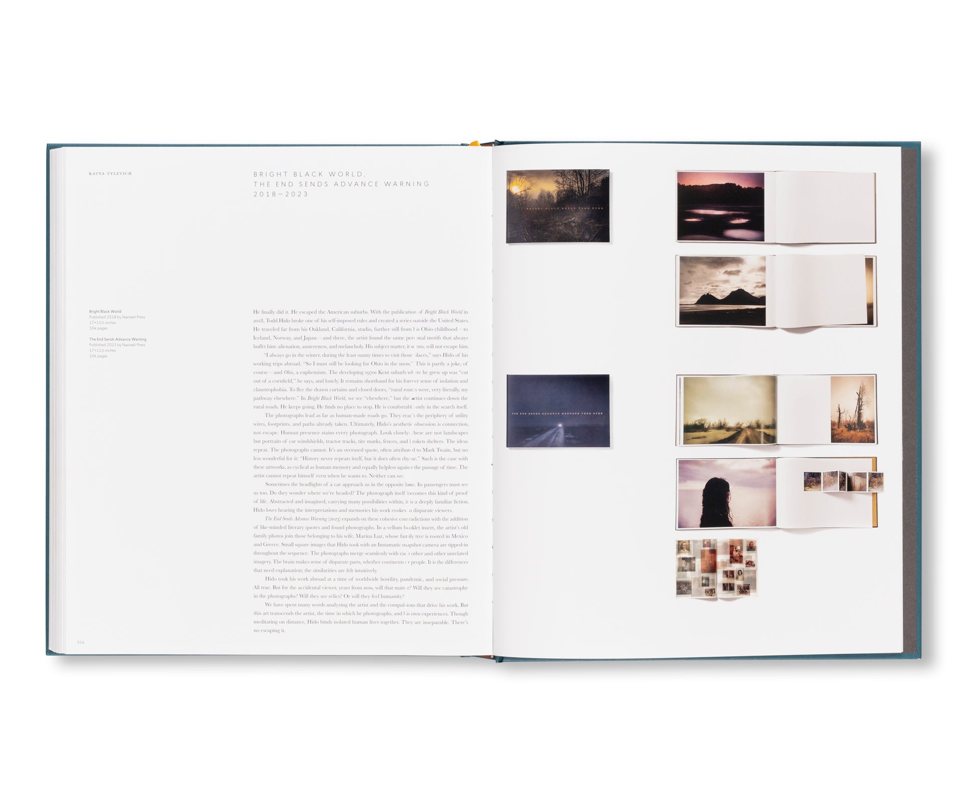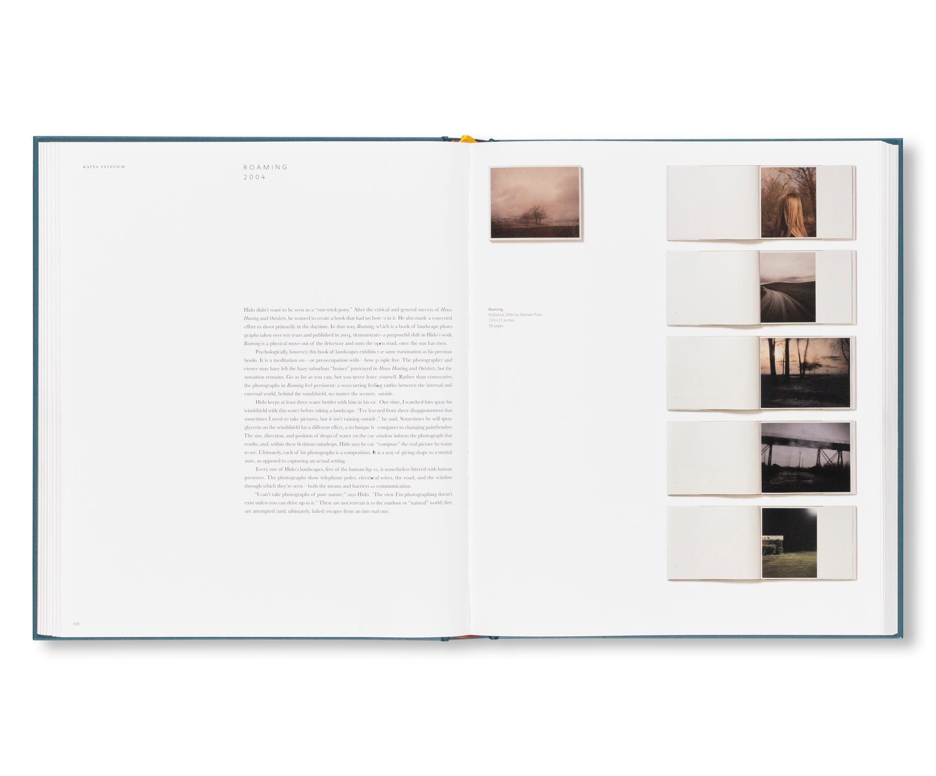 作者は過去に個々の作品シリーズを写真集として刊行しているが、本書は、最も象徴的なイメージとともに多くの未発表作品も収録し、そのキャリアの記録をまとめたものとしては最も包括的な一冊に仕上げられている。作品は年代順に構成され、それぞれのシリーズがいかに我々の心を踊らせるような形で重なり合ってきたか気付かされる。本書に寄稿しているキュレーター、ライター、そしてアーティストでもあるデヴィッド・カンパニー(David Campany)は、作品を紹介しつつ、作品が求める映画的な観客のあり方について考察する。作家であるカーチャ・ティレヴィッチ(Katya Tylevich)は、作者がこれまでに生み出してきた主要作品集の制作について思いを巡らし、「写真は人間が作った道と同じところへと導いてくれる。電線、足跡、これまでに辿った道の果てにまで届く」と語る。ティレヴィッチは作者のホームページでそれぞれの作品集に文章を寄せており、その内容とともに、これまでに刊行されてきた『HOUSE HUNTING』(2000年、2019年)、『OUTSKIRTS』(2002年、2021年)、『ROAMING』(2004年)、『BETWEEN THE TWO』(2006年)、『A ROAD DIVIDED』(2010年)、『EXCERPTS FROM SILVER MEADOWS』(2013年)、『BRIGHT BLACK WORLD』(2018年)、『THE END SENDS ADVANCE WARNING』(2023年)、そして特装版や実験的な作品の書影が添えられている。