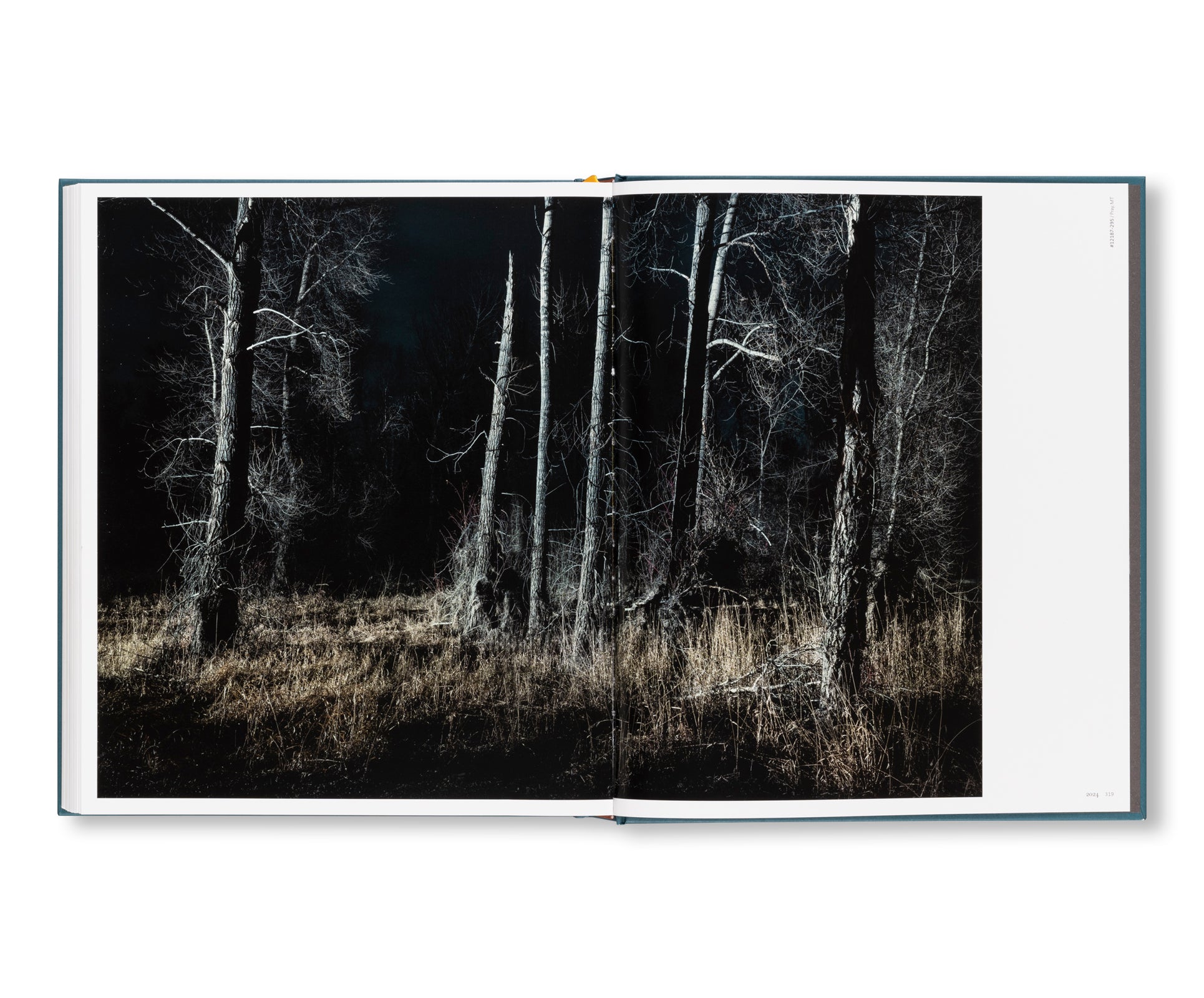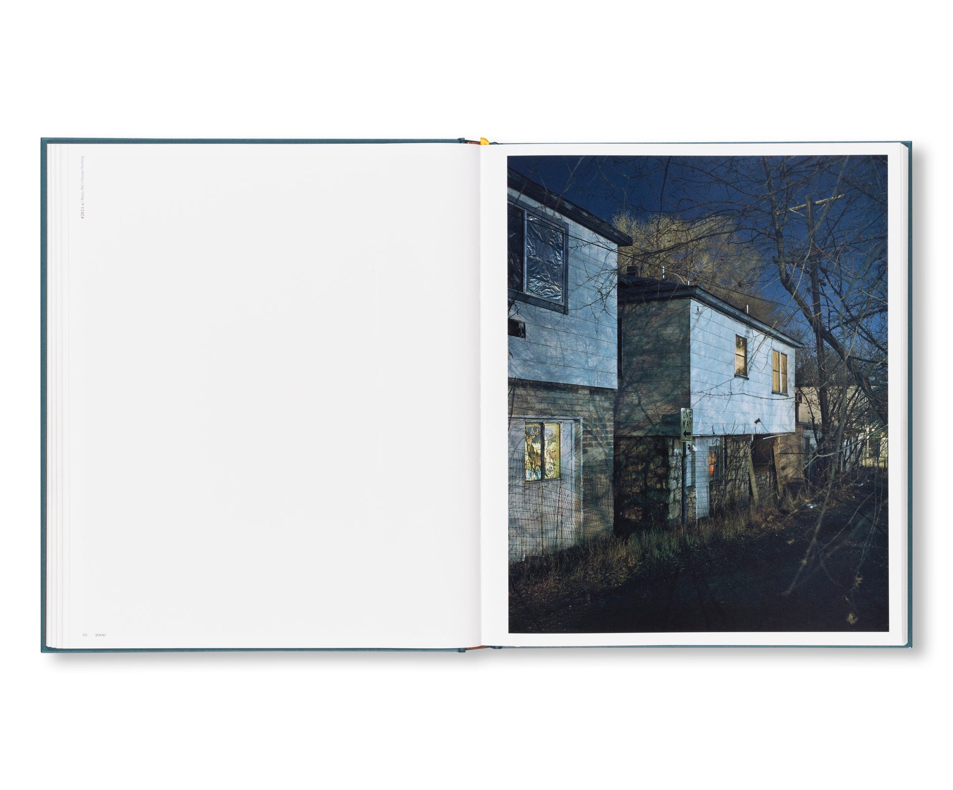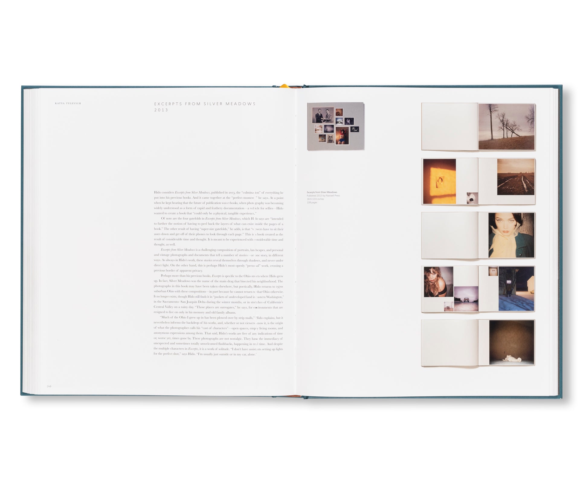 作者は過去に個々の作品シリーズを写真集として刊行しているが、本書は、最も象徴的なイメージとともに多くの未発表作品も収録し、そのキャリアの記録をまとめたものとしては最も包括的な一冊に仕上げられている。作品は年代順に構成され、それぞれのシリーズがいかに我々の心を踊らせるような形で重なり合ってきたか気付かされる。本書に寄稿しているキュレーター、ライター、そしてアーティストでもあるデヴィッド・カンパニー(David Campany)は、作品を紹介しつつ、作品が求める映画的な観客のあり方について考察する。作家であるカーチャ・ティレヴィッチ(Katya Tylevich)は、作者がこれまでに生み出してきた主要作品集の制作について思いを巡らし、「写真は人間が作った道と同じところへと導いてくれる。電線、足跡、これまでに辿った道の果てにまで届く」と語る。ティレヴィッチは作者のホームページでそれぞれの作品集に文章を寄せており、その内容とともに、これまでに刊行されてきた『HOUSE HUNTING』(2000年、2019年)、『OUTSKIRTS』(2002年、2021年)、『ROAMING』(2004年)、『BETWEEN THE TWO』(2006年)、『A ROAD DIVIDED』(2010年)、『EXCERPTS FROM SILVER MEADOWS』(2013年)、『BRIGHT BLACK WORLD』(2018年)、『THE END SENDS ADVANCE WARNING』(2023年)、そして特装版や実験的な作品の書影が添えられている。